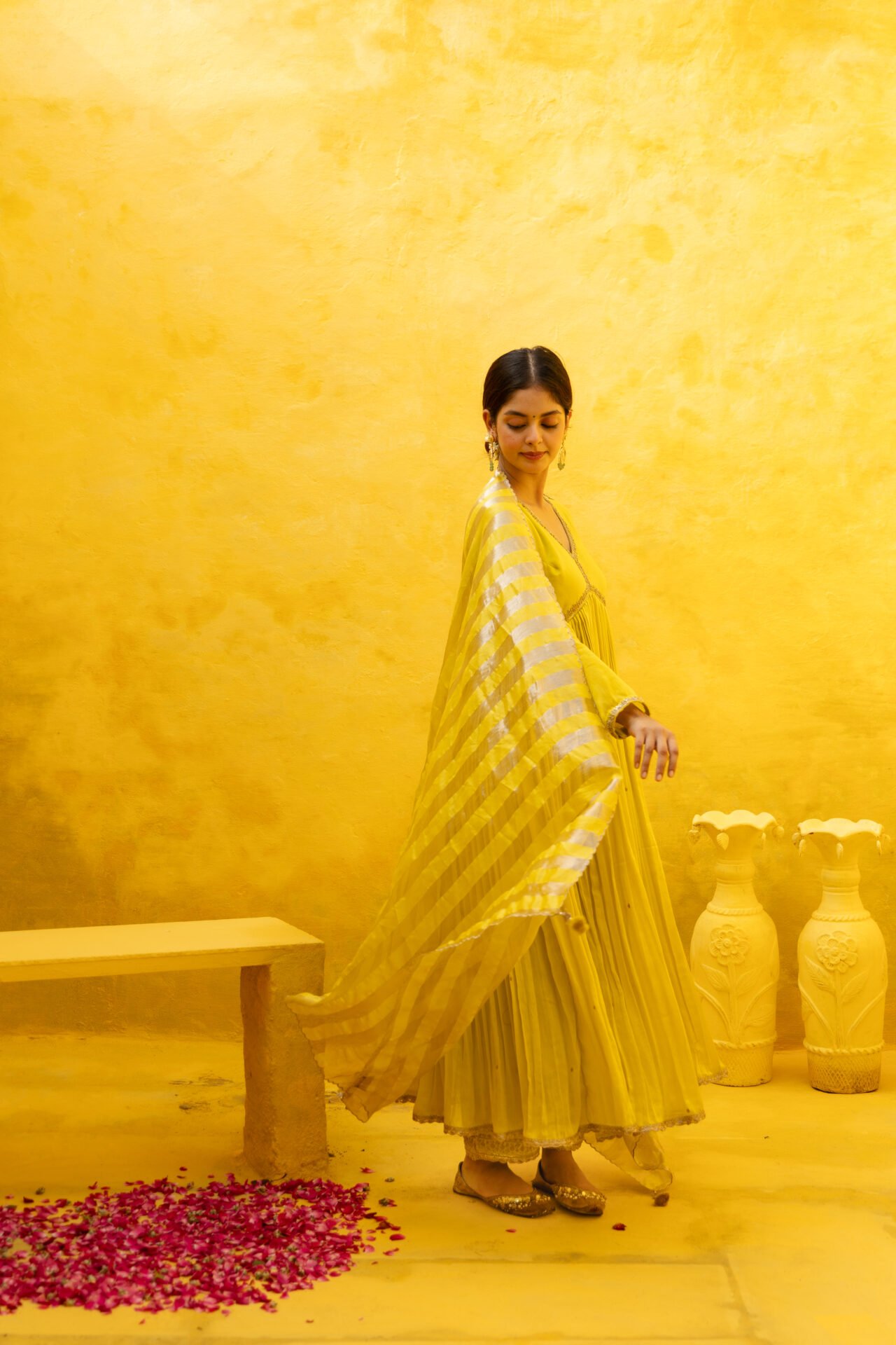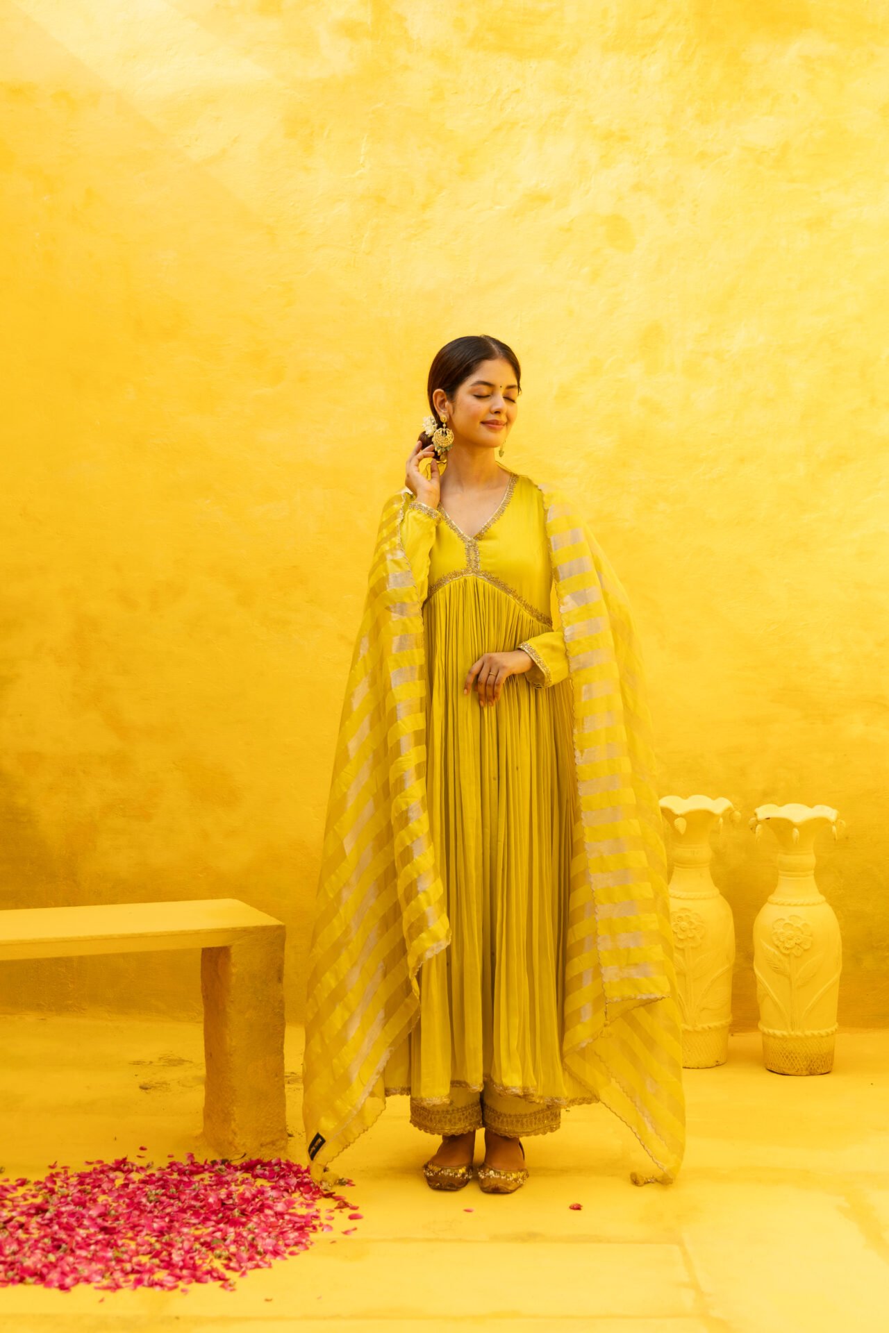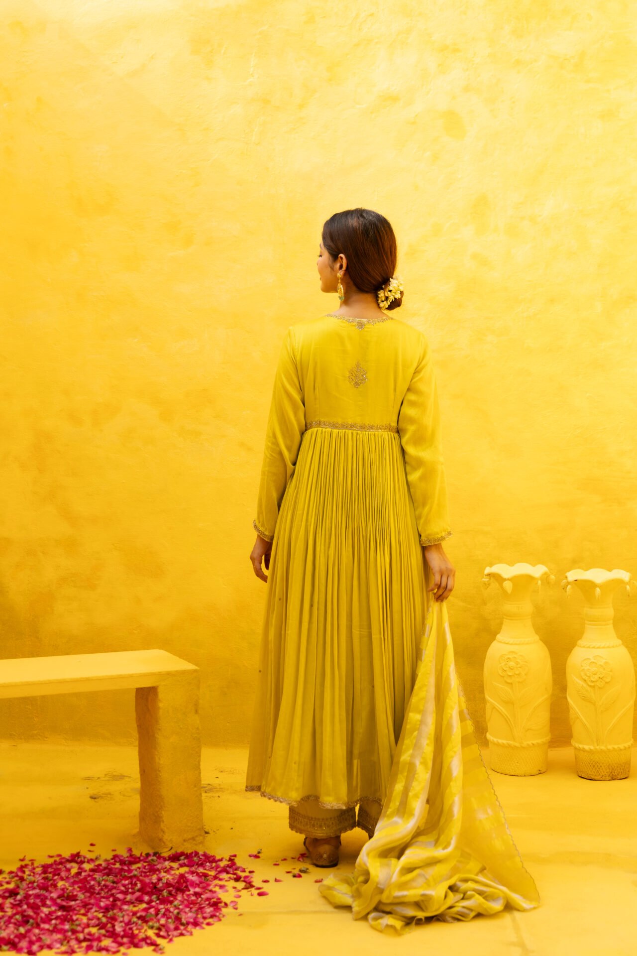 This elegant Zardozi hand-embroidered silk Chanderi Anarkali ensemble is adorned with a beautifully crafted, voluminous ghera for a graceful, flowing silhouette. The exquisite neckline and intricately designed yoke elevate the overall elegance of the piece, adding a touch of refined artistry. It is paired with a pure striped tissue scalloped dupatta, finished with intricate handmade tassels that add a sophisticated touch. The ensemble is completed with matching hand-embroidered pants, offering a perfect balance of luxury and craftsmanship.