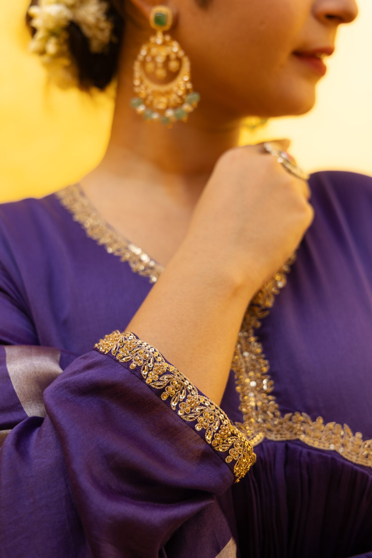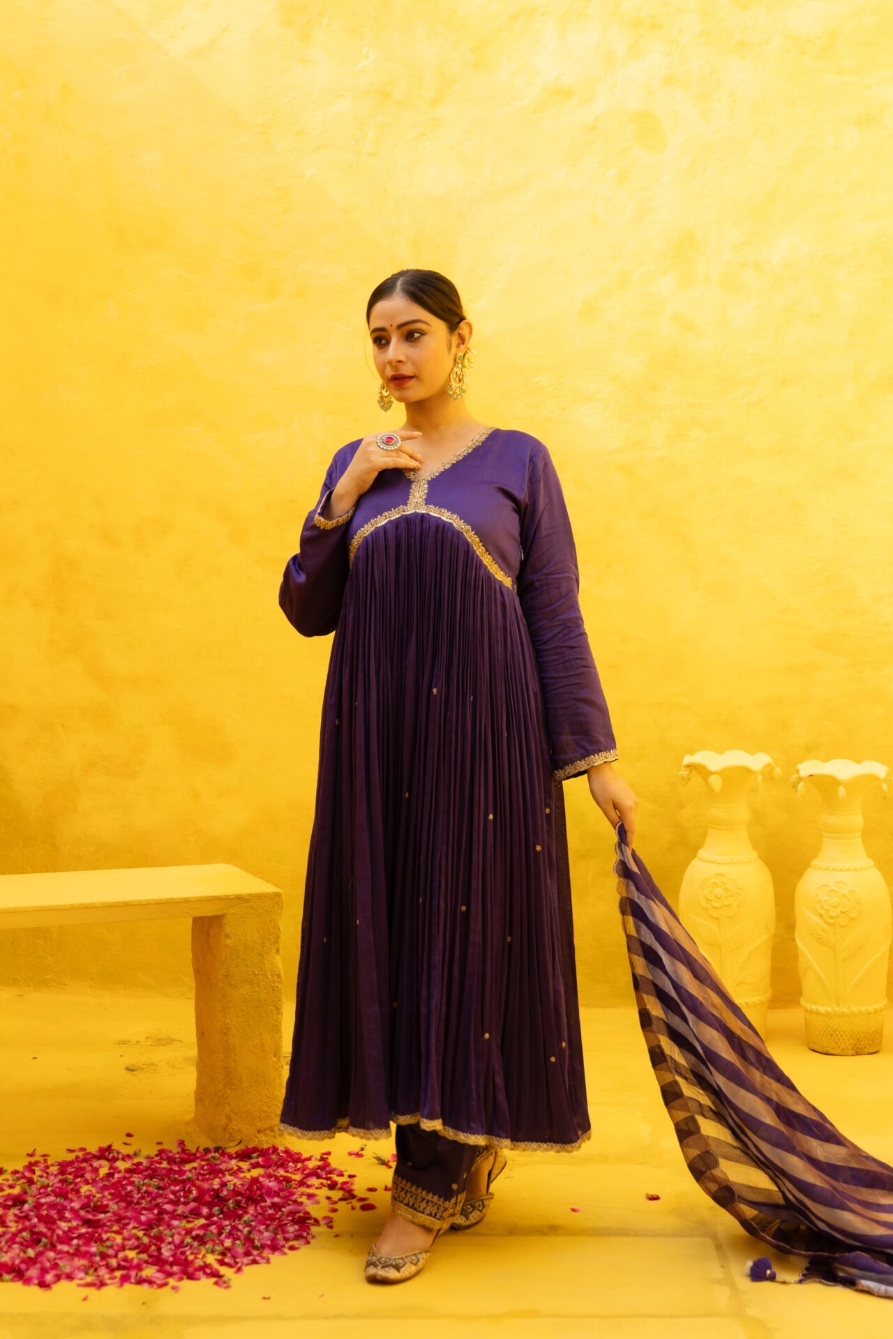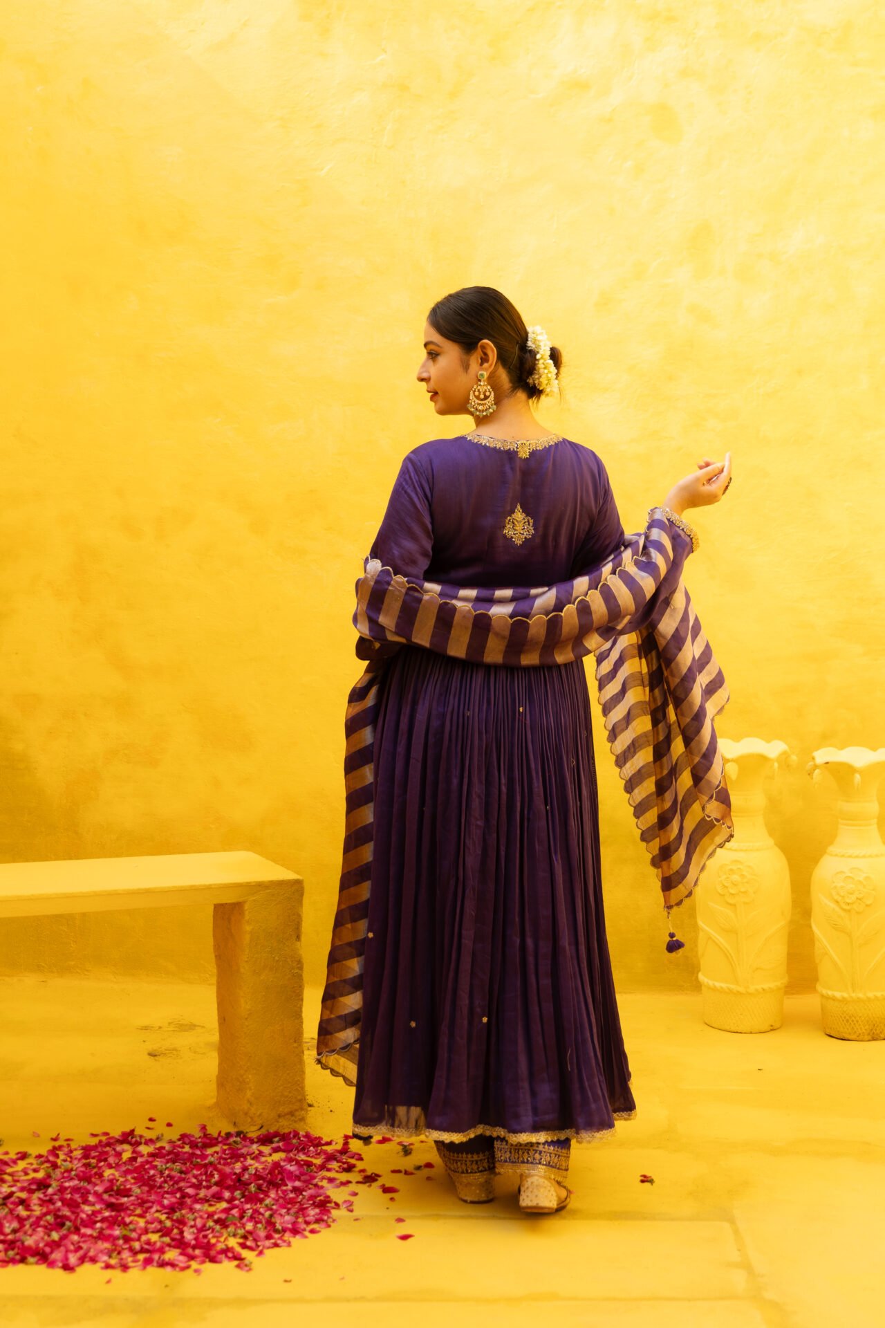 This elegant Zardozi hand-embroidered silk Chanderi Anarkali ensemble is adorned with a beautifully crafted, voluminous ghera for a graceful, flowing silhouette. The exquisite neckline and intricately designed yoke elevate the overall elegance of the piece, adding a touch of refined artistry. It is paired with a pure striped tissue scalloped dupatta, finished with intricate handmade tassels that add a sophisticated touch. The ensemble is completed with matching hand-embroidered pants, offering a perfect balance of luxury and craftsmanship.