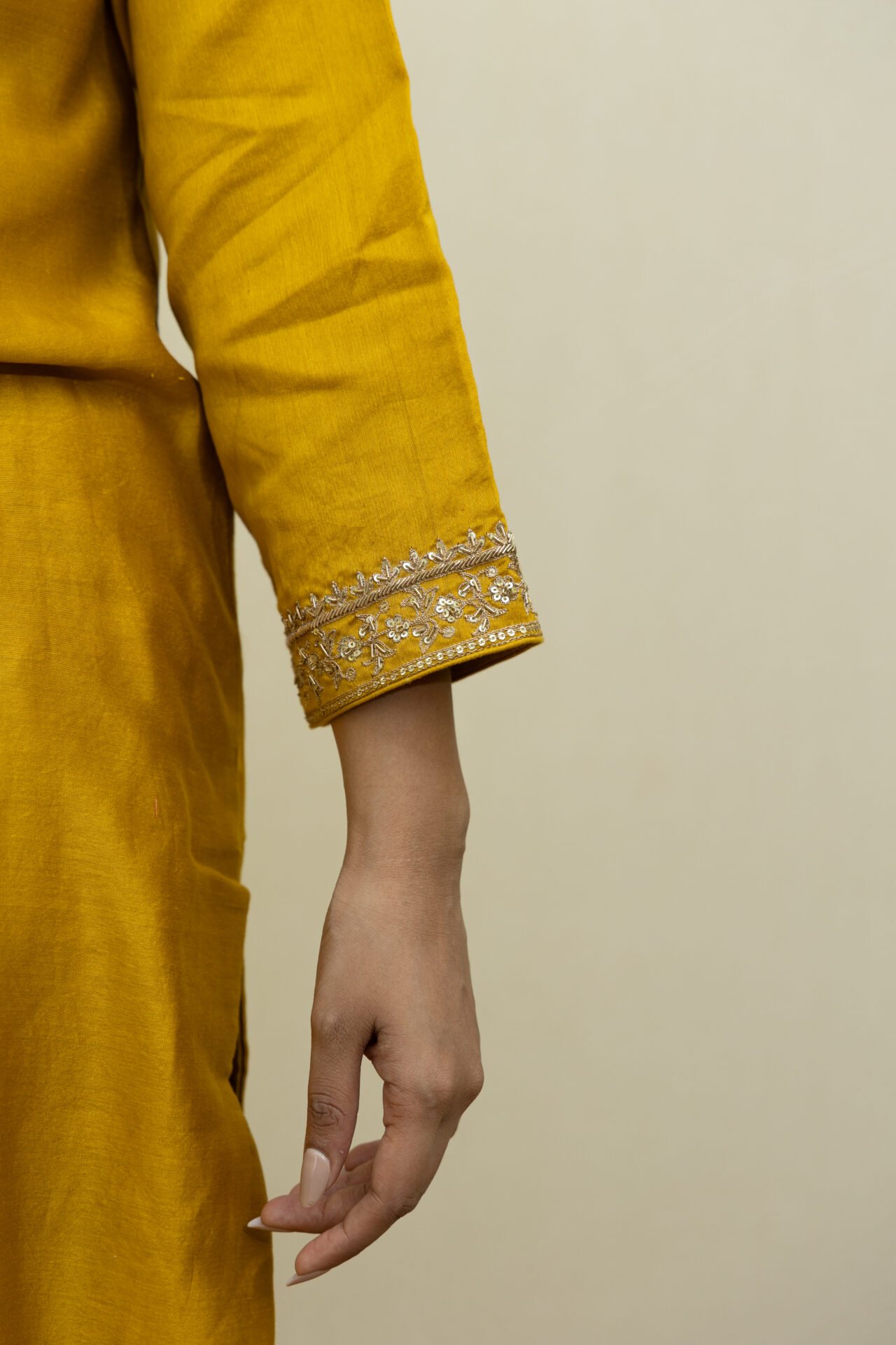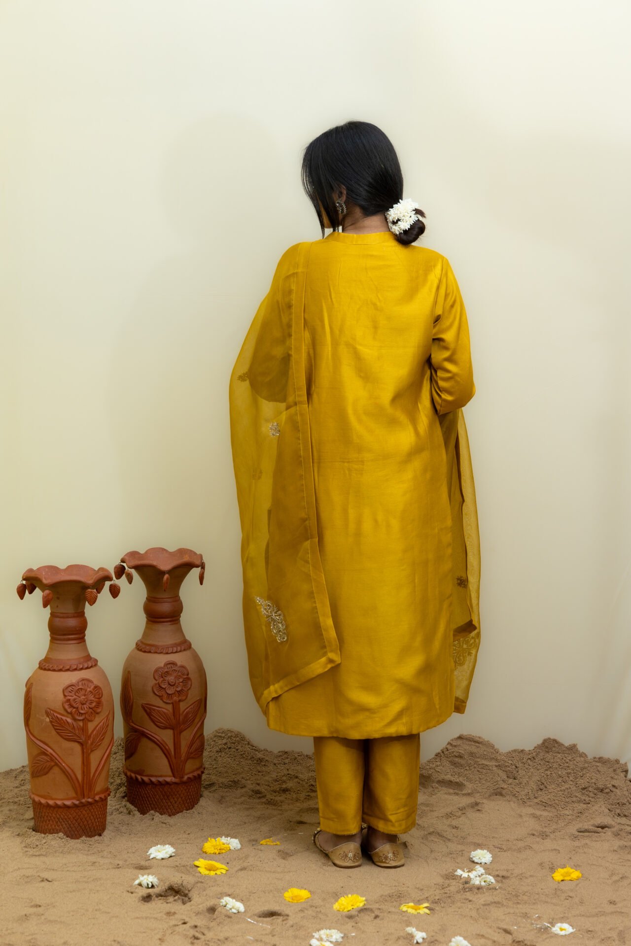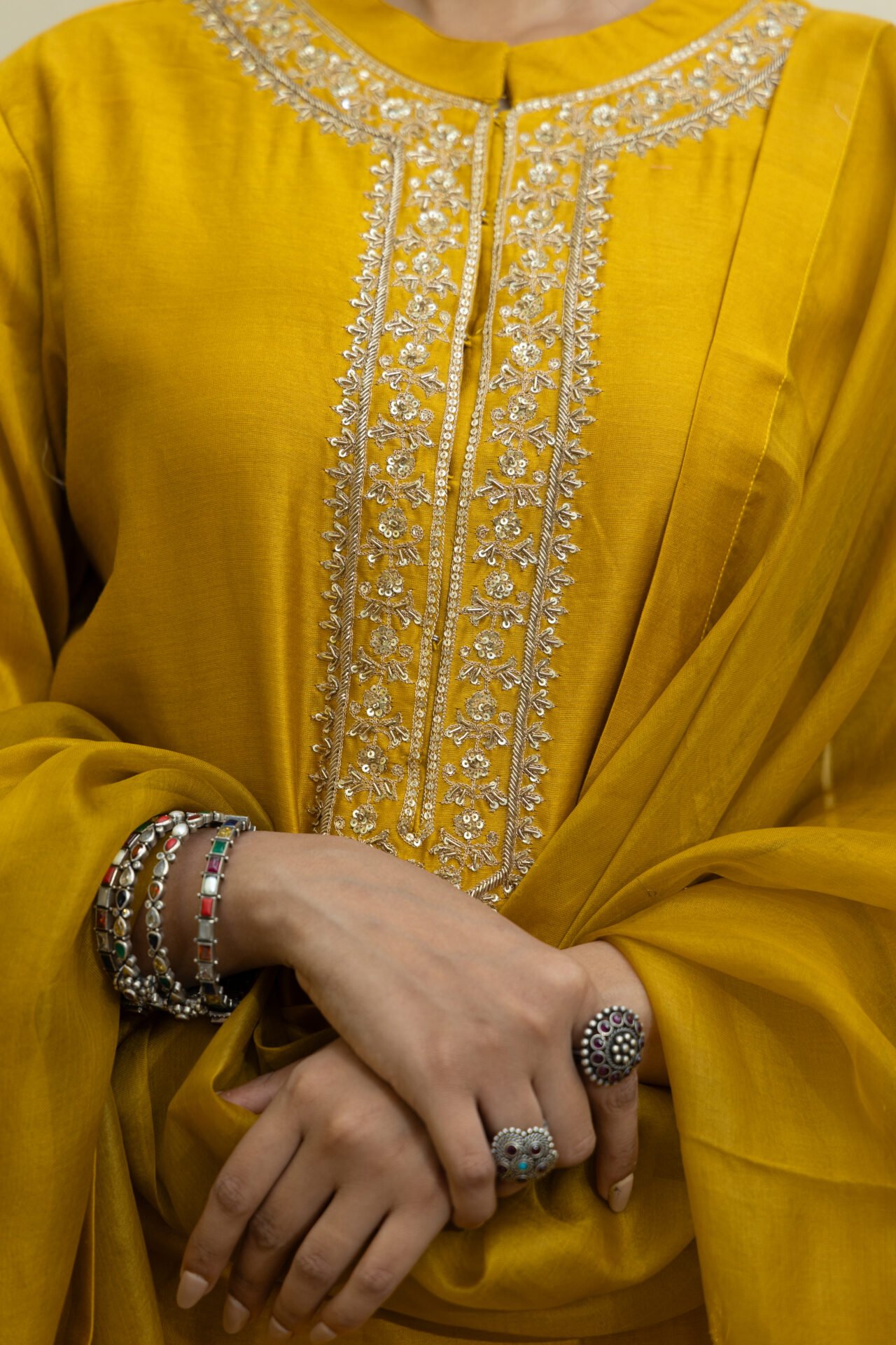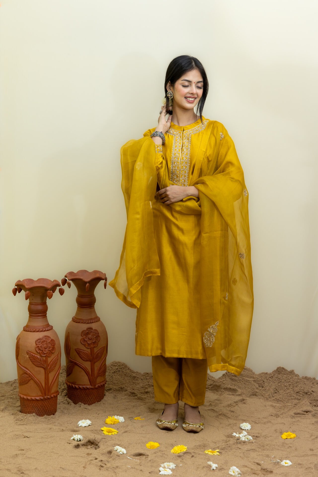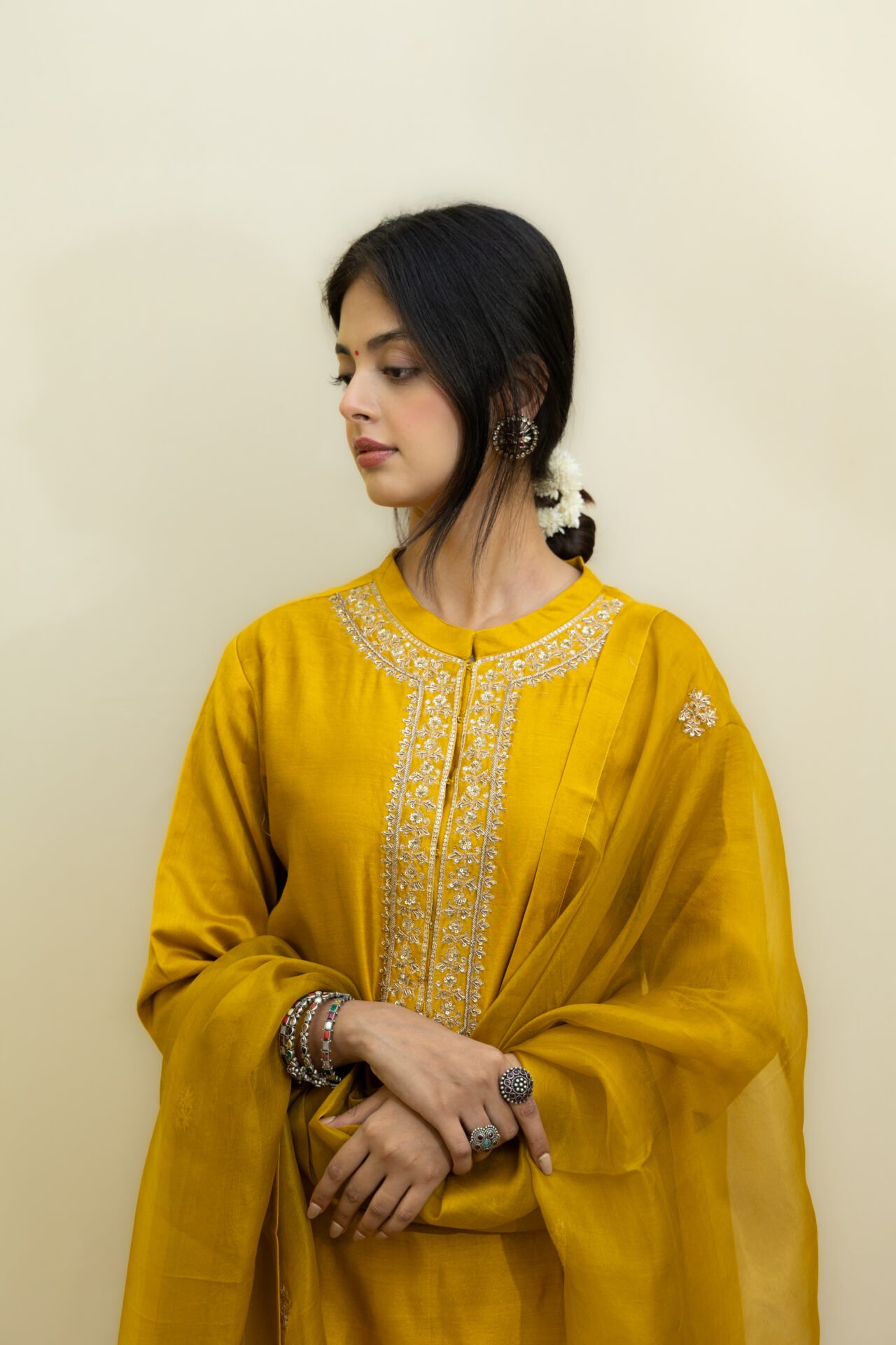 Silk Chanderi Zardozi Embroidered Kurta with Organza Dupatta & Slim Fit Pants,This luxurious Silk Chanderi kurta is intricately embroidered with zardozi, creating a stunning blend of opulence and traditional craftsmanship. Paired with a hand-embroidered organza dupatta, the ensemble radiates elegance, with delicate detailing that elevates its charm. The look is completed with slim fit pants, offering a contemporary silhouette that perfectly balances the grandeur of the kurta. A sophisticated choice for those seeking a blend of timeless embroidery and modern design.