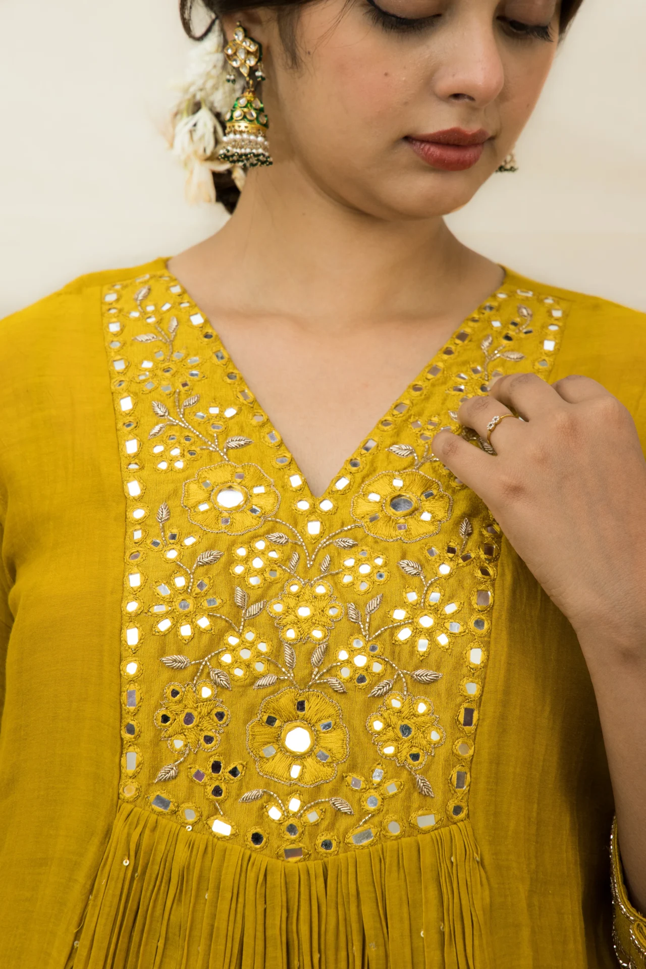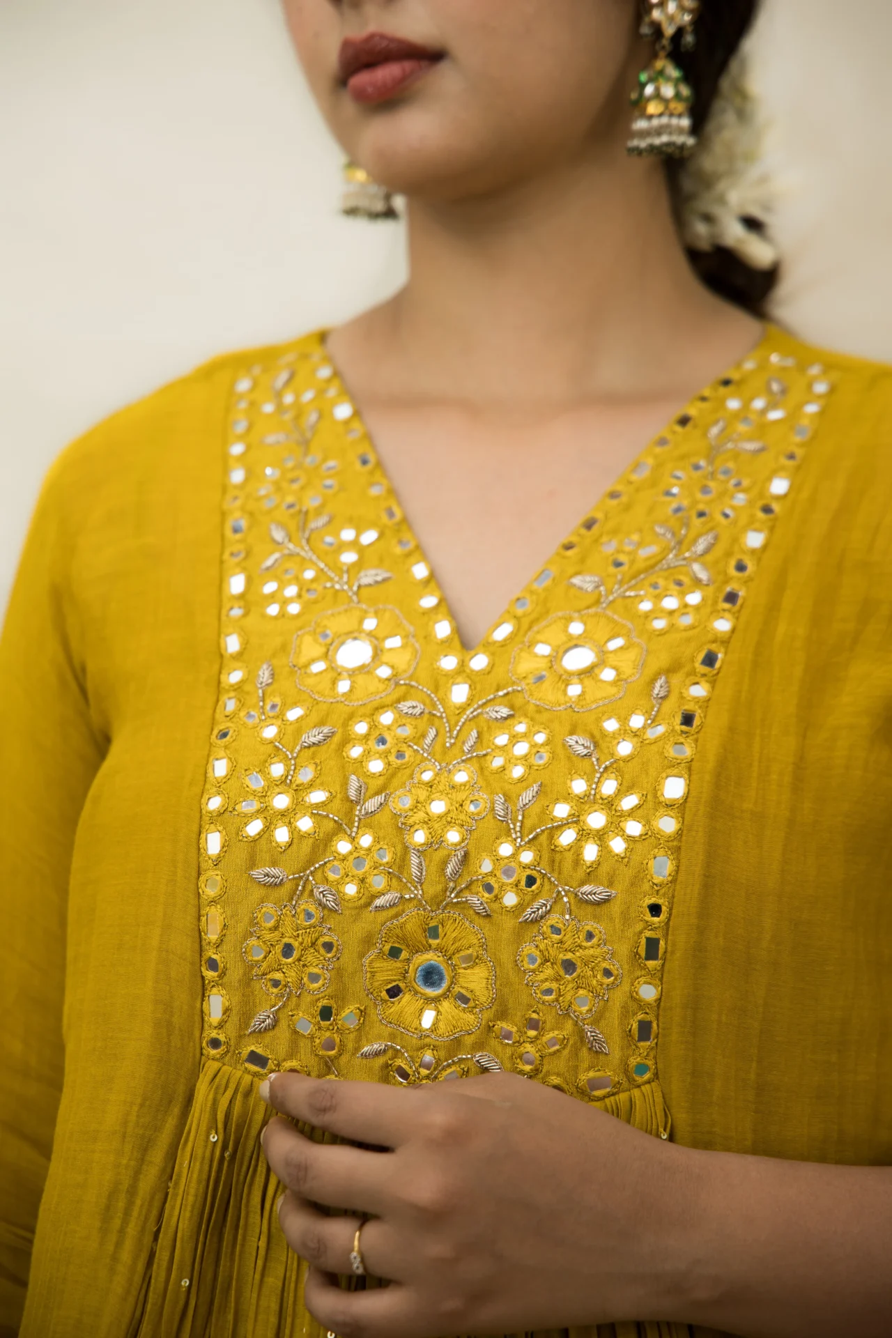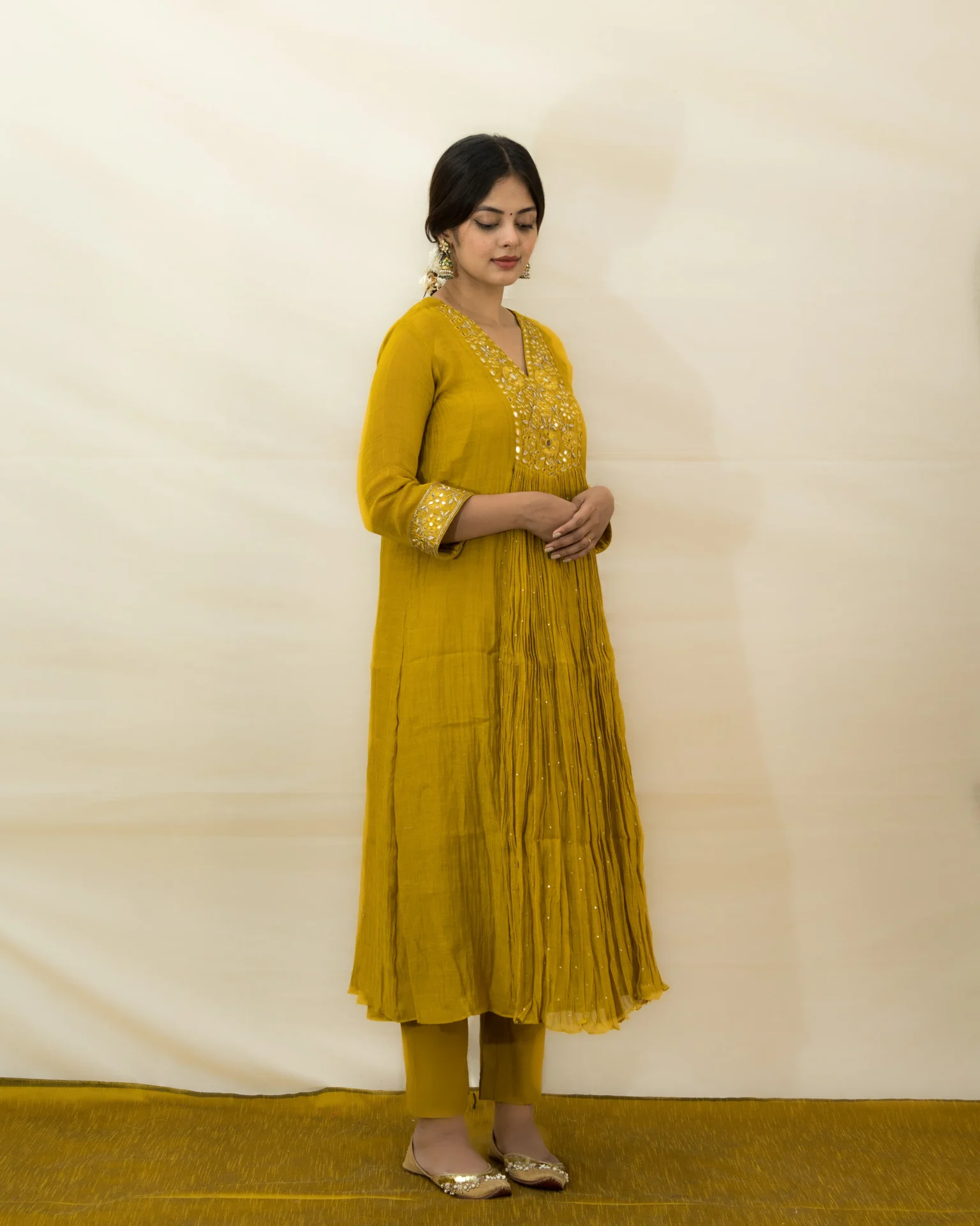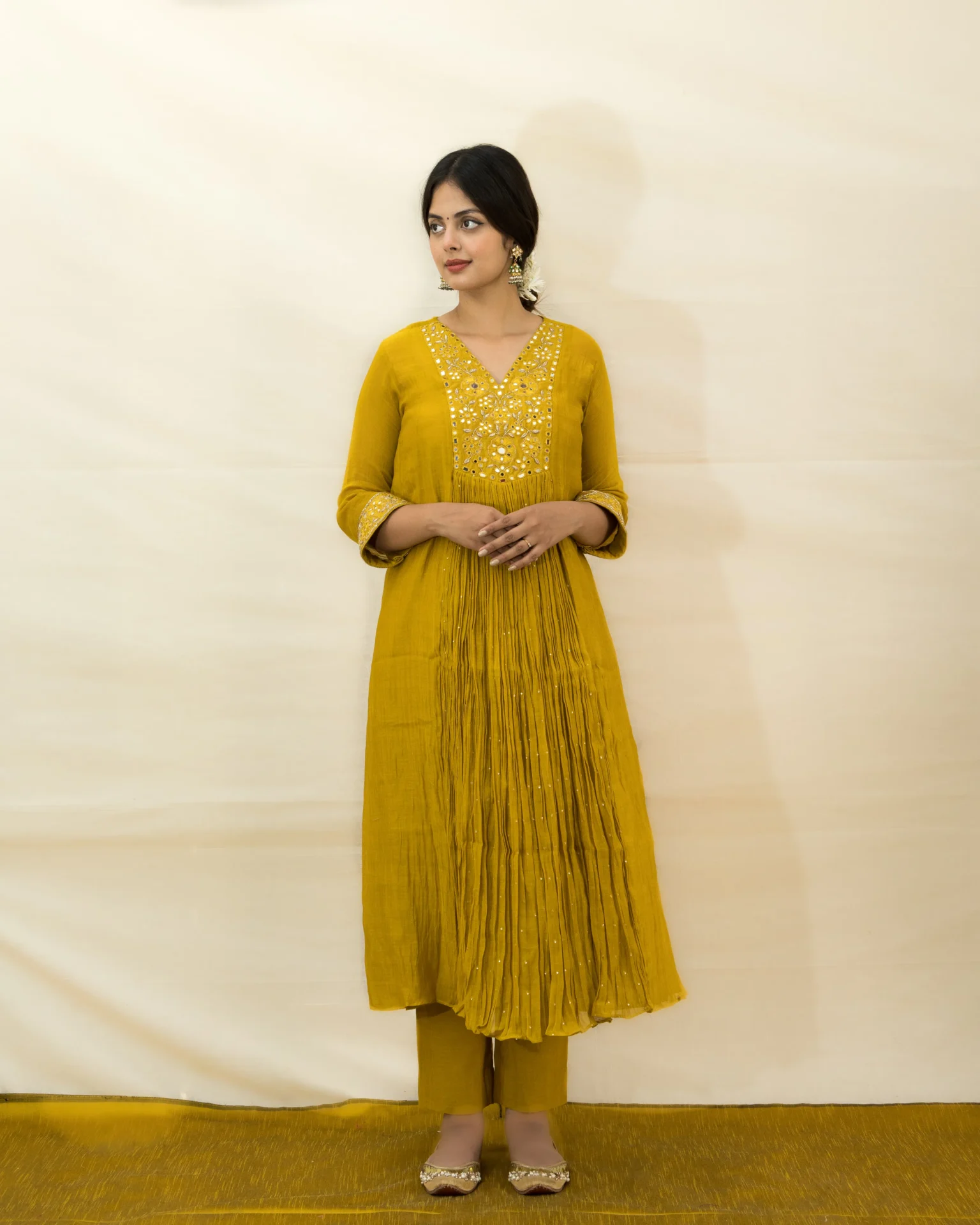 Front Gathered Panel Tunic set is handcrafted in pure sheer Malai Chanderi WITH hand embroidered fine silk yoke embellished with hand cut mirror and fine Resham ZARDOZI . To complete the look we have added slim fit Chanderi pants.