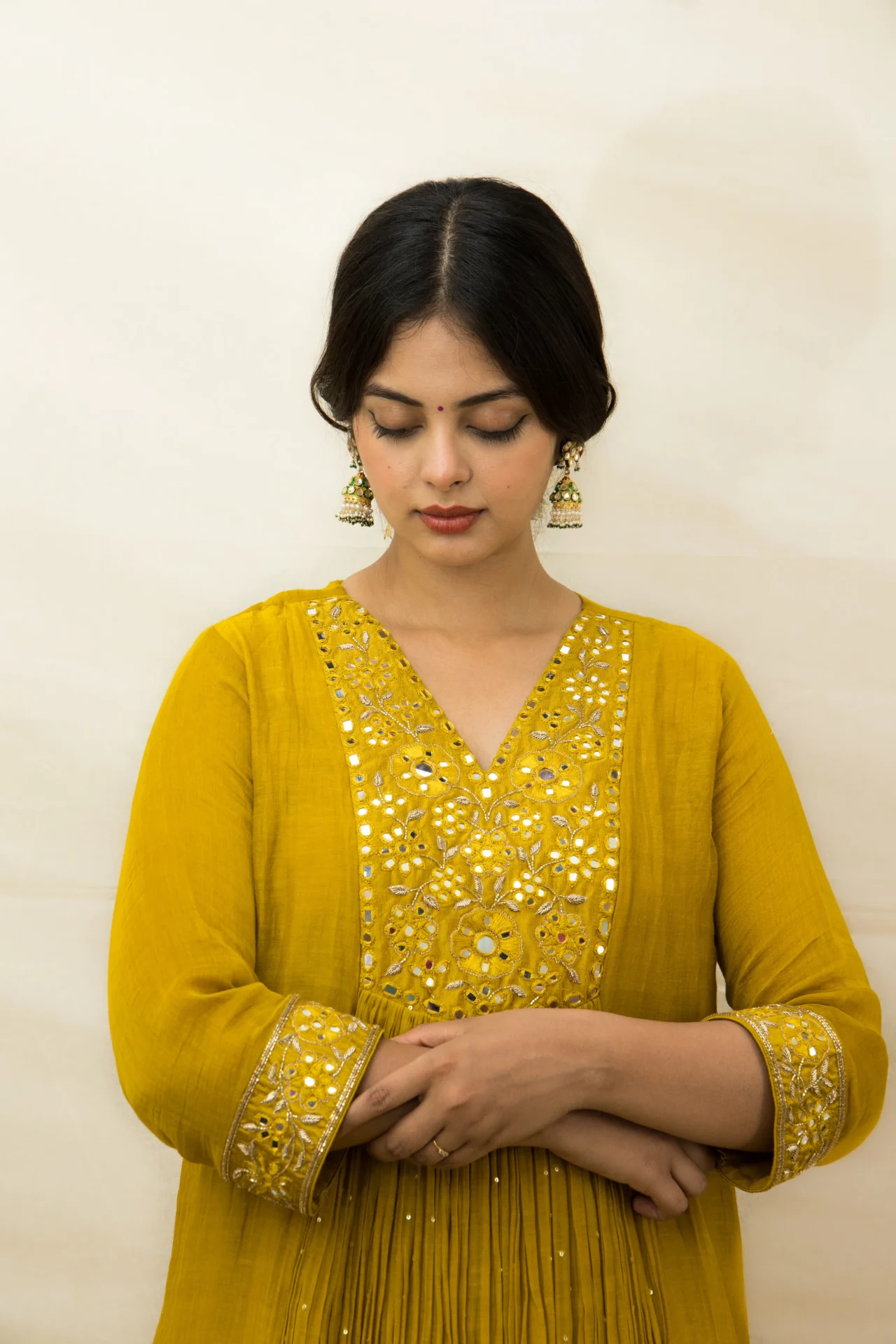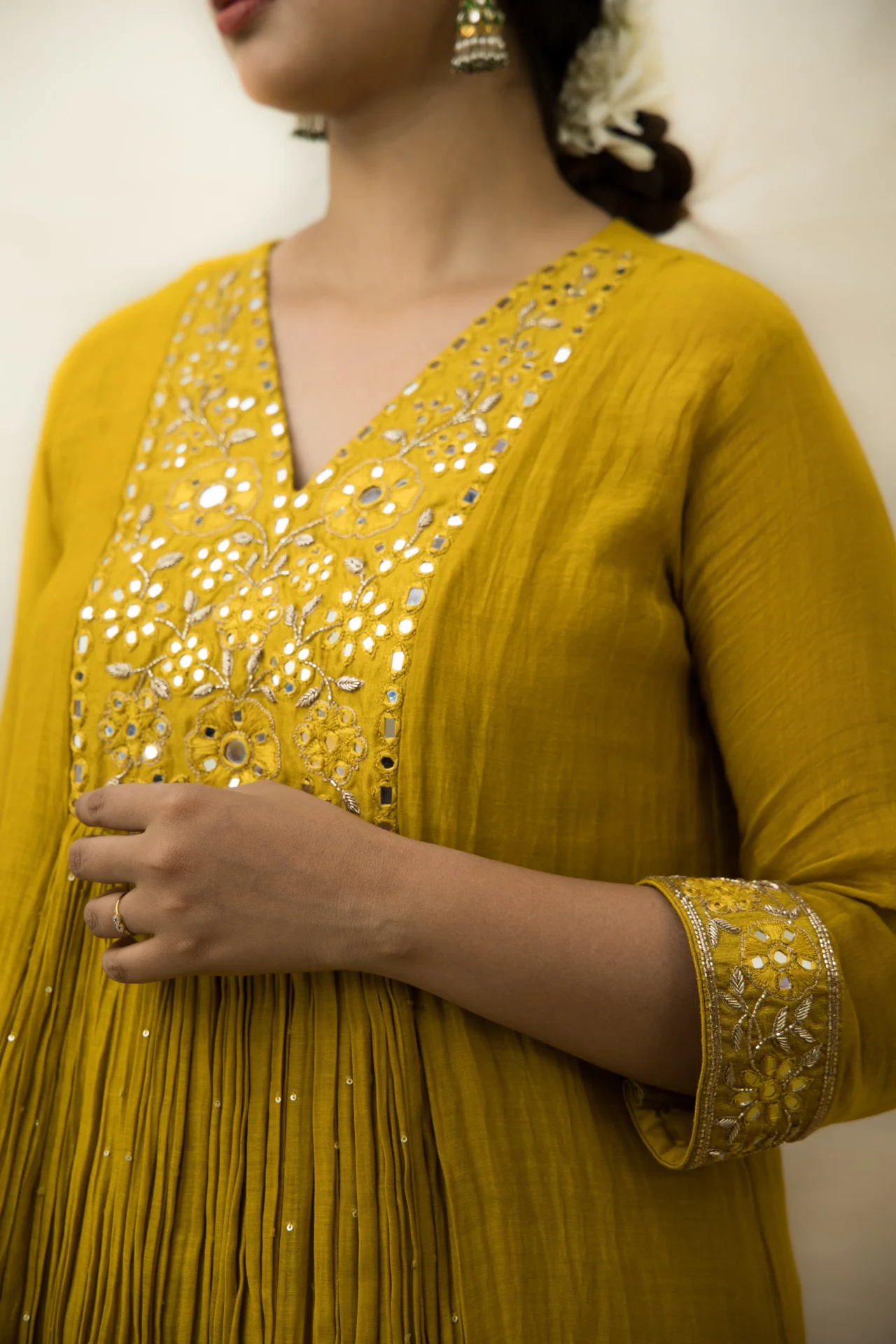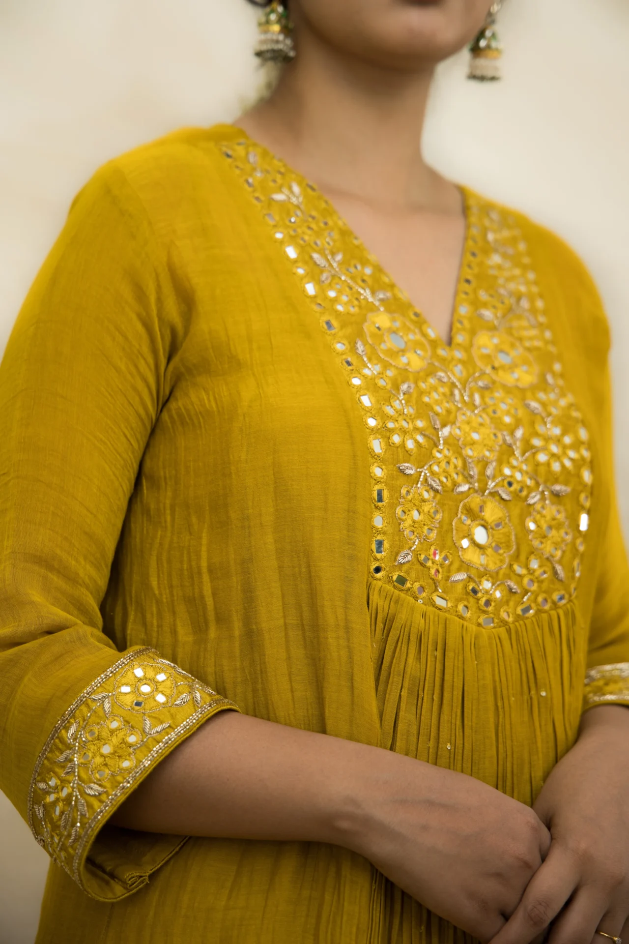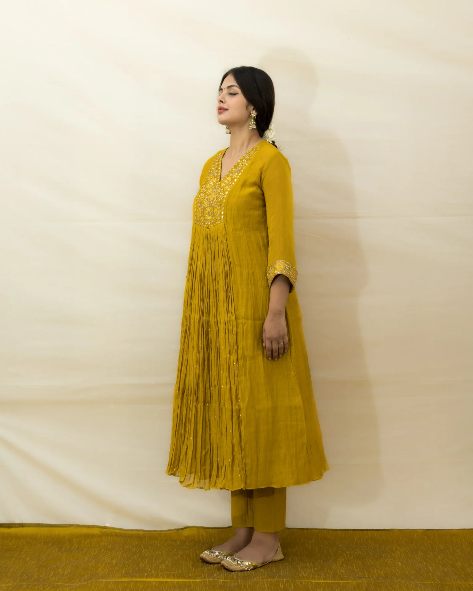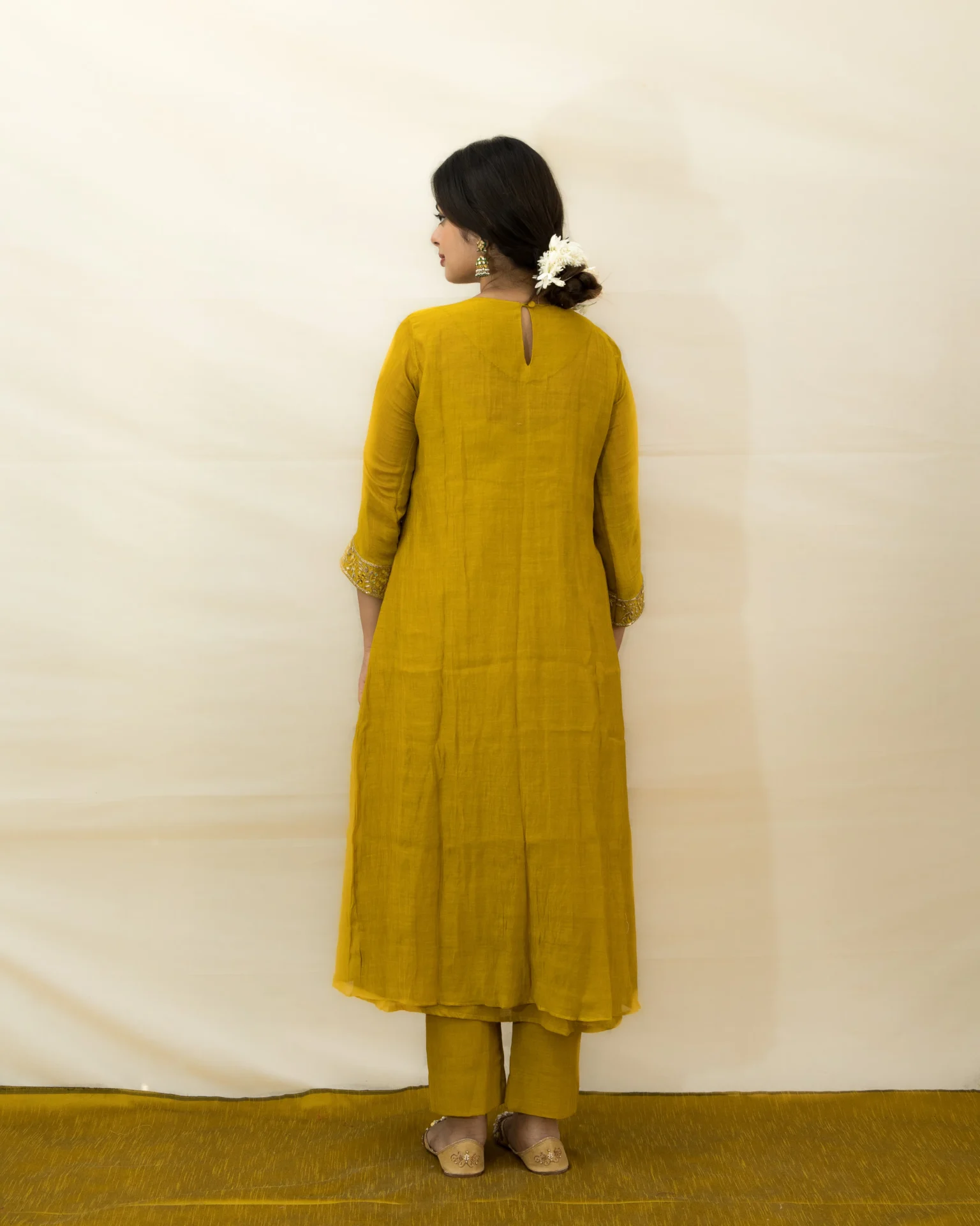 Front Gathered Panel Tunic set is handcrafted in pure sheer Malai Chanderi WITH hand embroidered fine silk yoke embellished with hand cut mirror and fine Resham ZARDOZI . To complete the look we have added slim fit Chanderi pants.