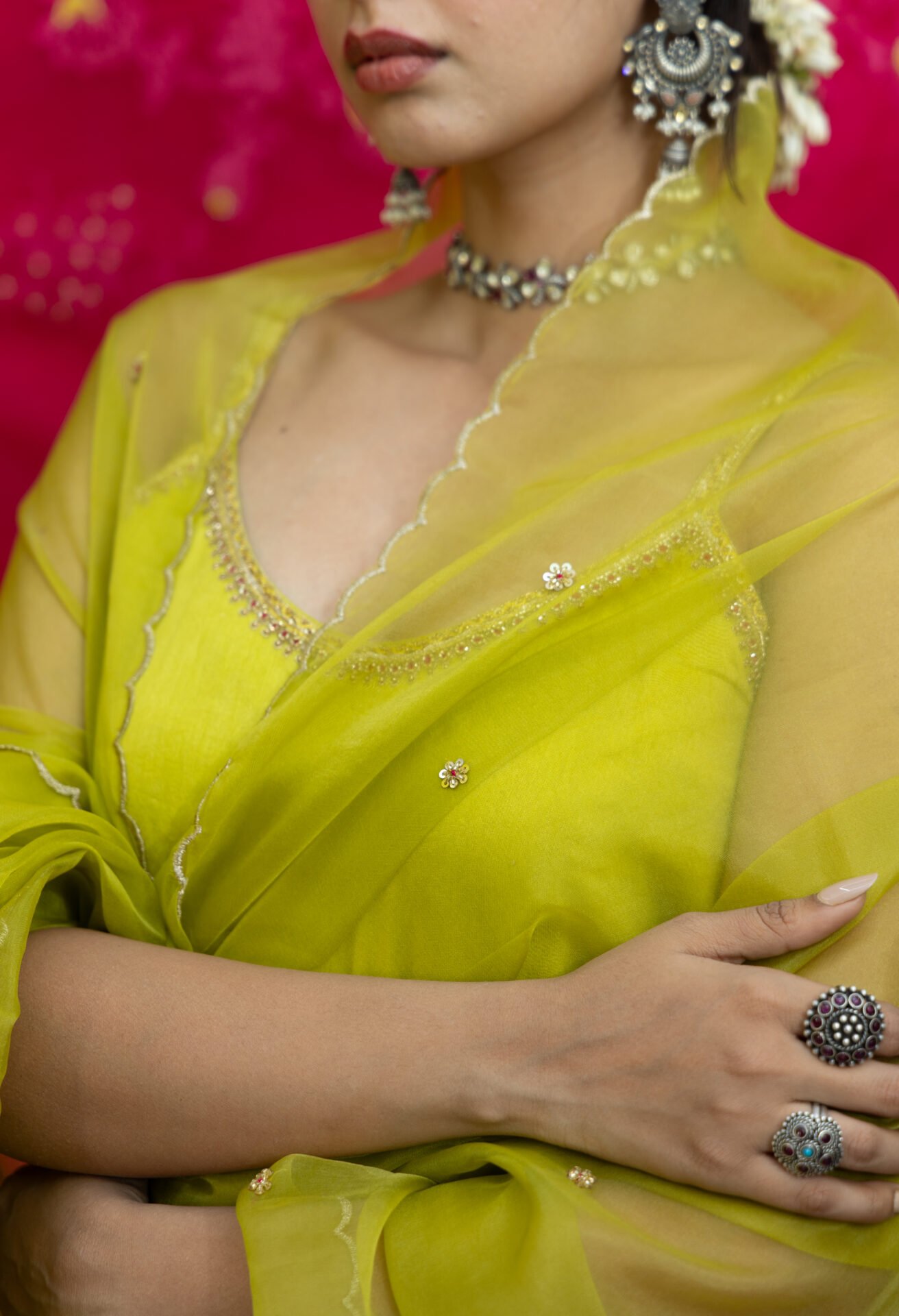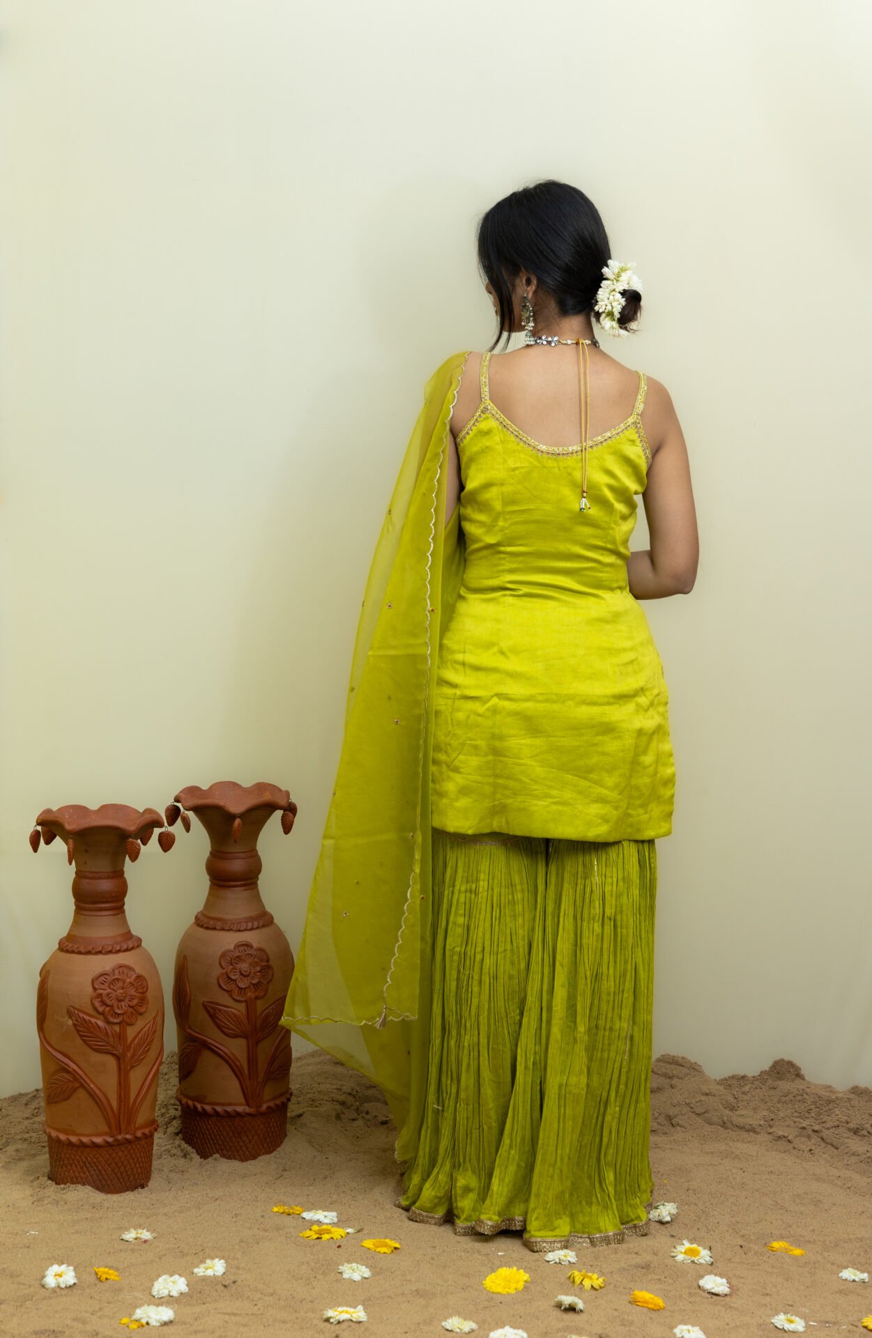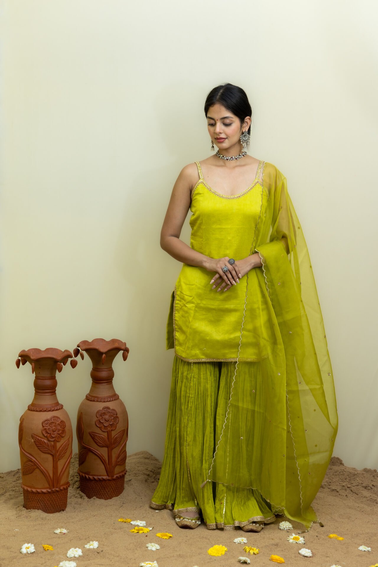 Silk Chanderi Hand-Embroidered Short Kurta with Cotton Sharara,This elegant Silk Chanderi short kurta is a testament to exquisite craftsmanship, featuring intricate hand embroidery that adds a timeless touch to the piece. Paired with a comfortable cotton sharara, the ensemble combines traditional allure with modern sensibilities. The look is beautifully complemented by a hand-embroidered organza dupatta, adding a layer of sophistication and grace. A perfect choice for those seeking a delicate yet striking outfit, rich in detail and timeless style.