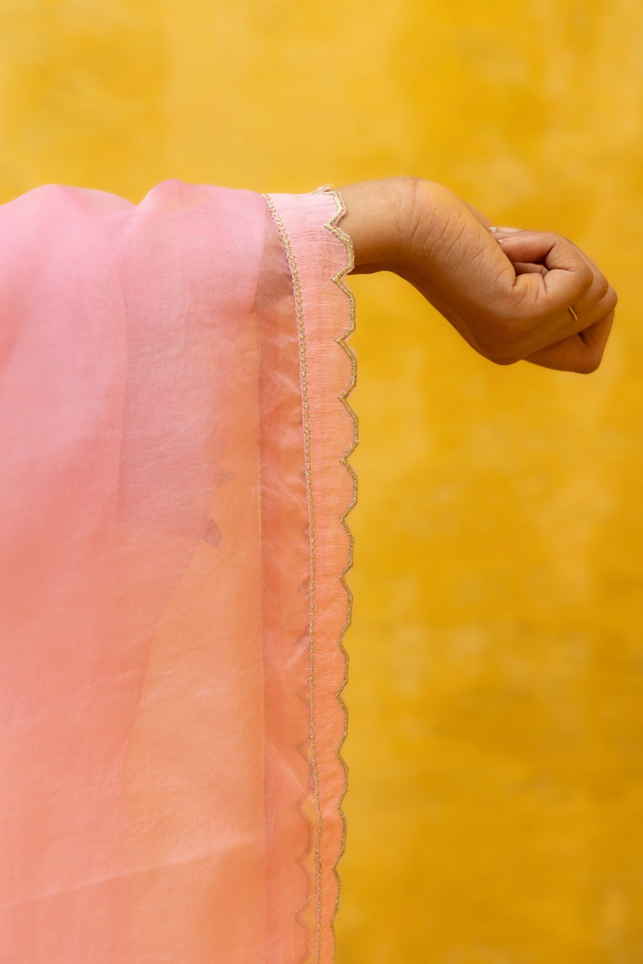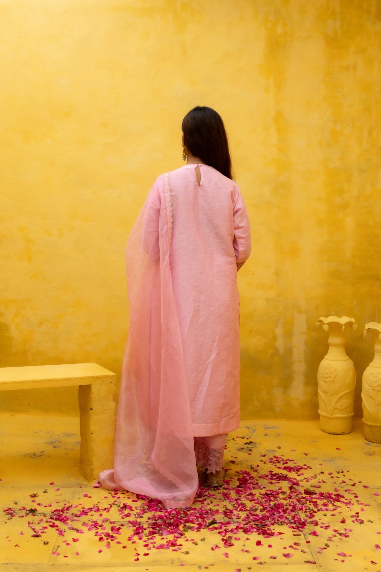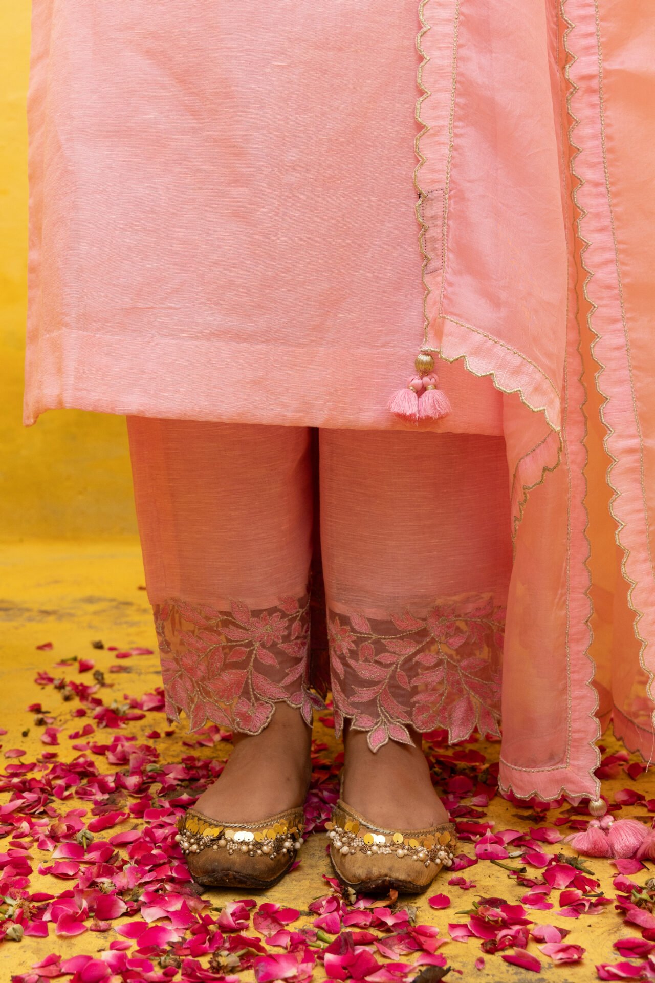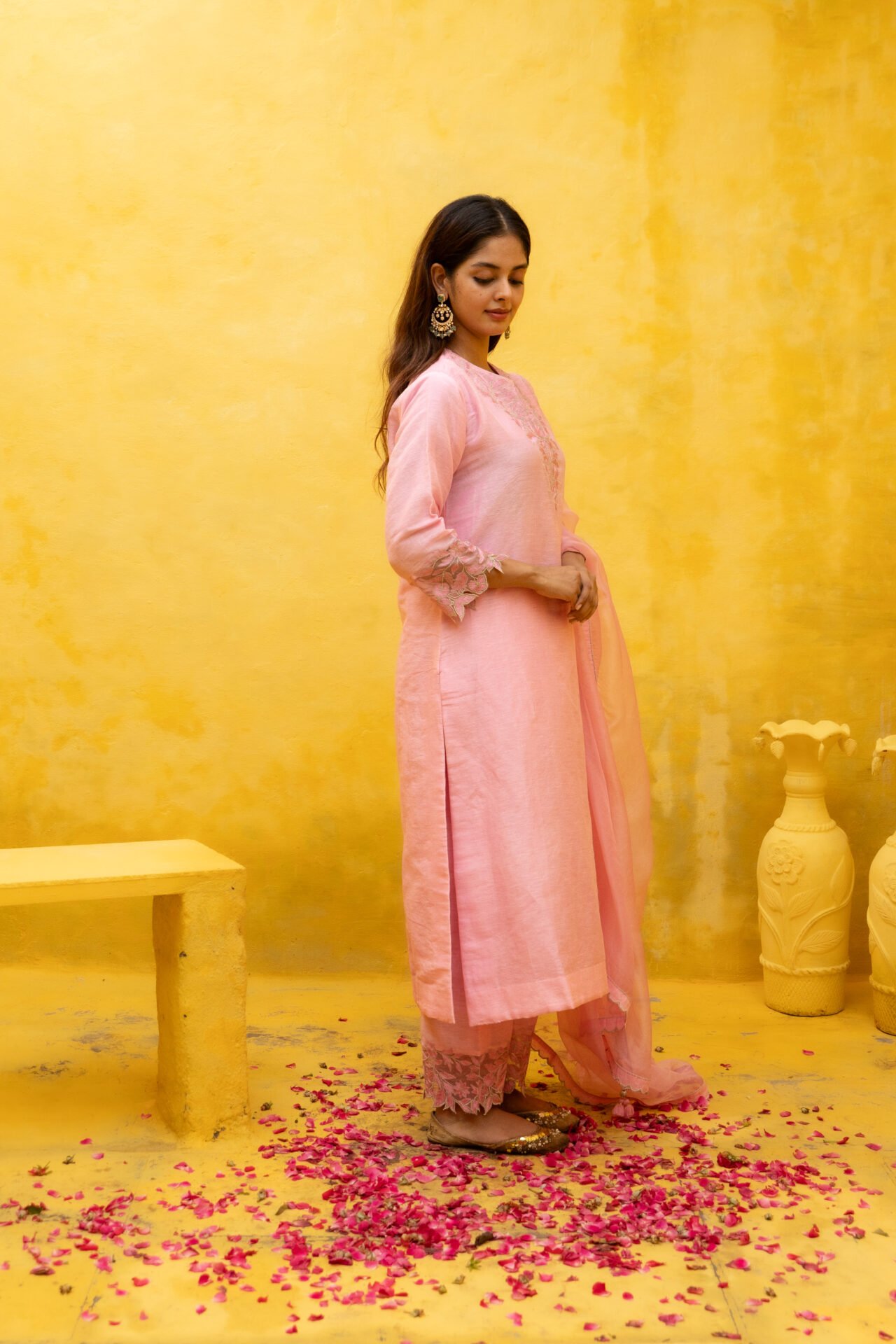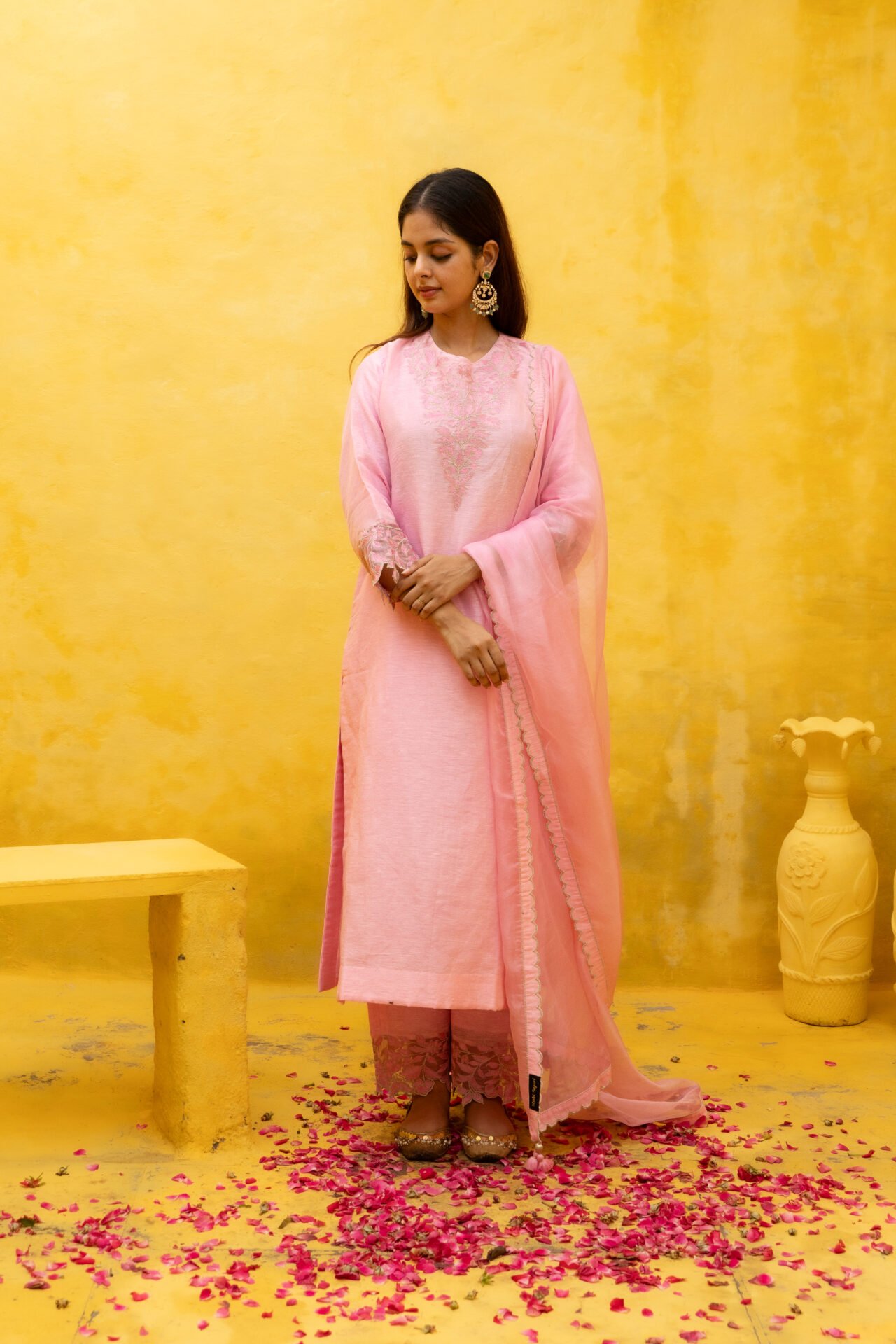 Crafted in fine jute linen, this ensemble in a refreshing baby pink hue offers a perfect blend of elegance and comfort. The kurta features intricate ek taar tonal Resham and zari embroidery, adding a delicate yet striking detail. The sleeves and pants are adorned with matching cutwork borders, crafted on pure silk organza, bringing a touch of refinement to the look. The kurta’s straight-cut pattern flatters all body types, offering both style and ease. The dupatta, made of pure silk organza, is finished with a jute linen cutwork border and hand-made tassels on the edging, adding a graceful, hand-crafted finish to this sophisticated set. kurta Finished with façade edges and hand-done turpai, this set reflects timeless elegance and craftsmanship