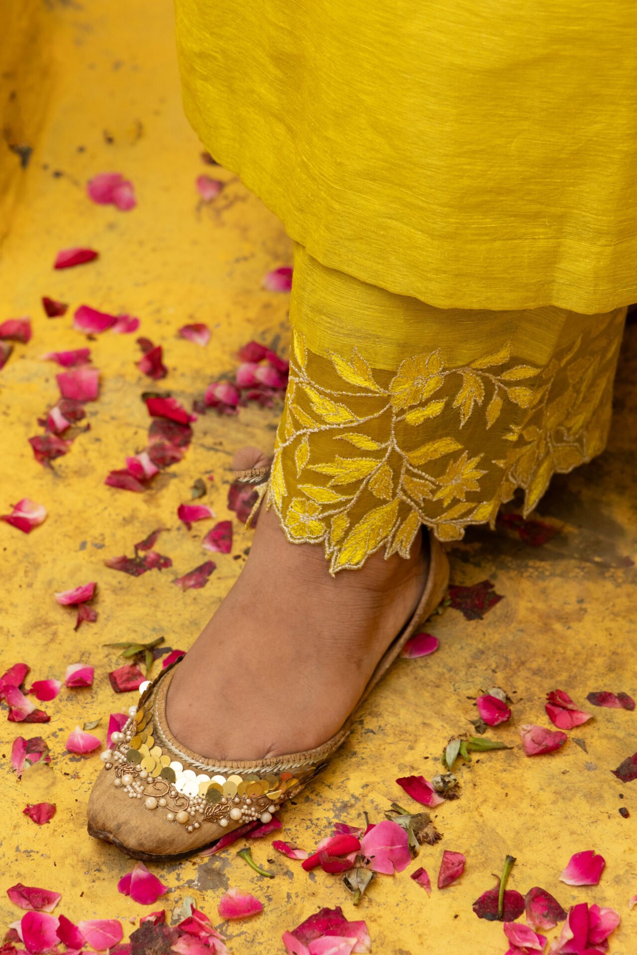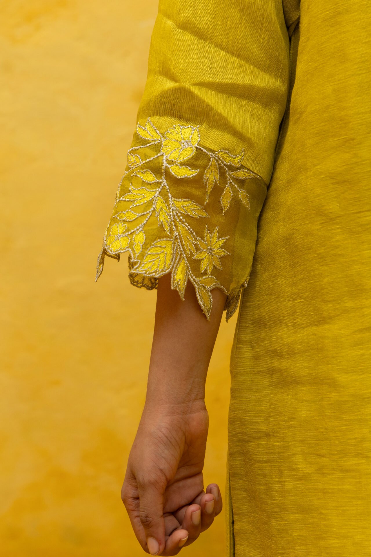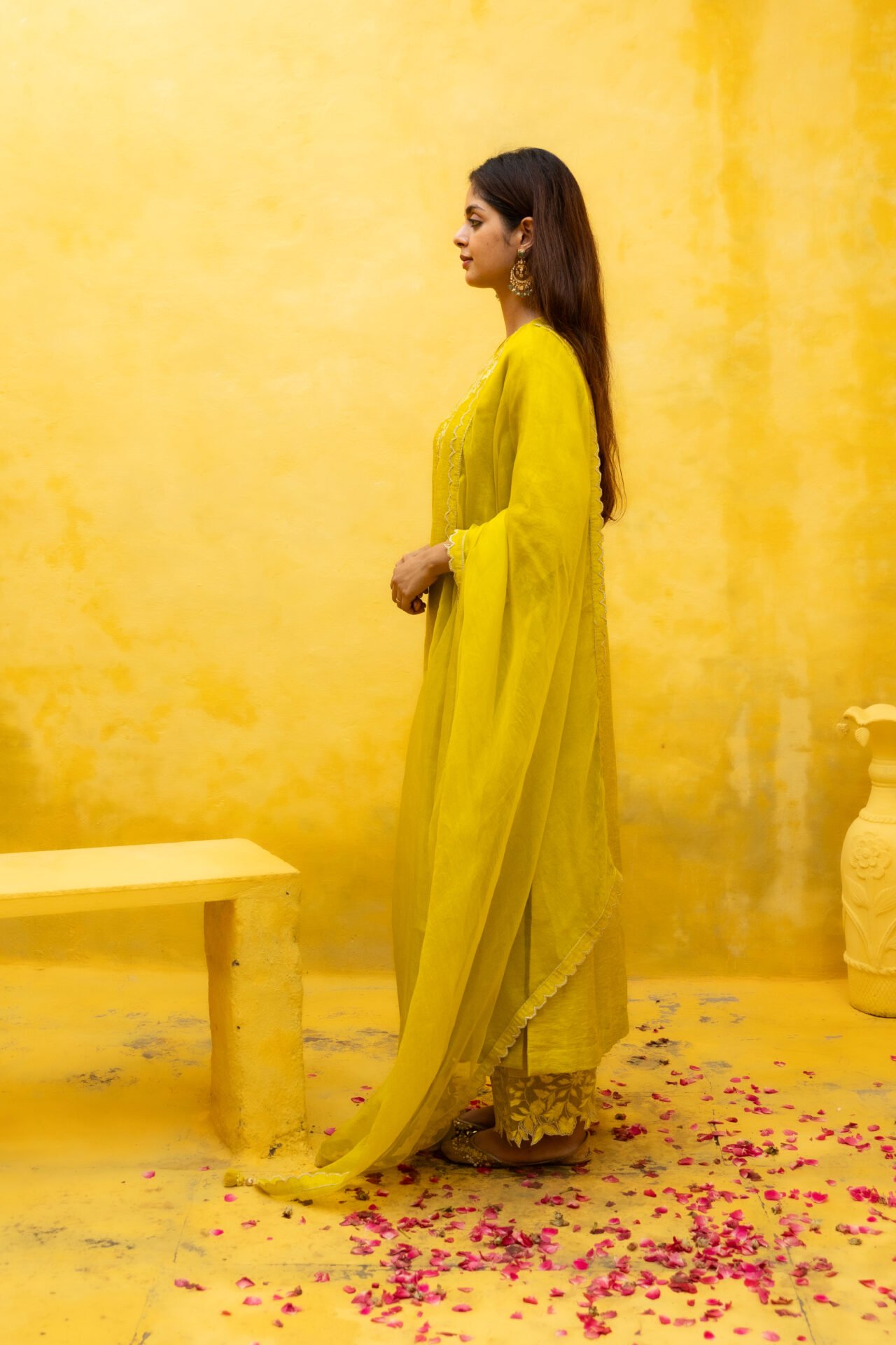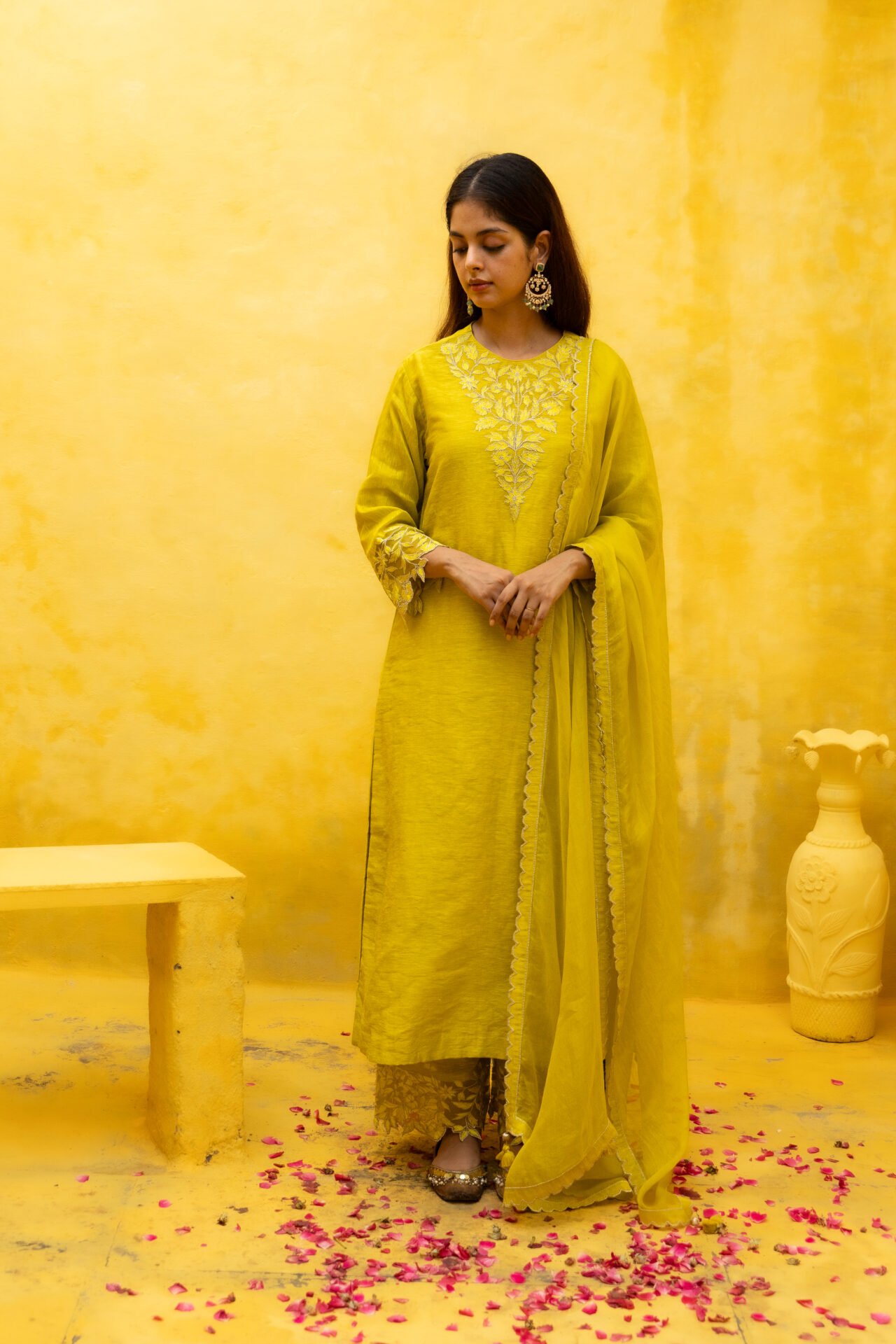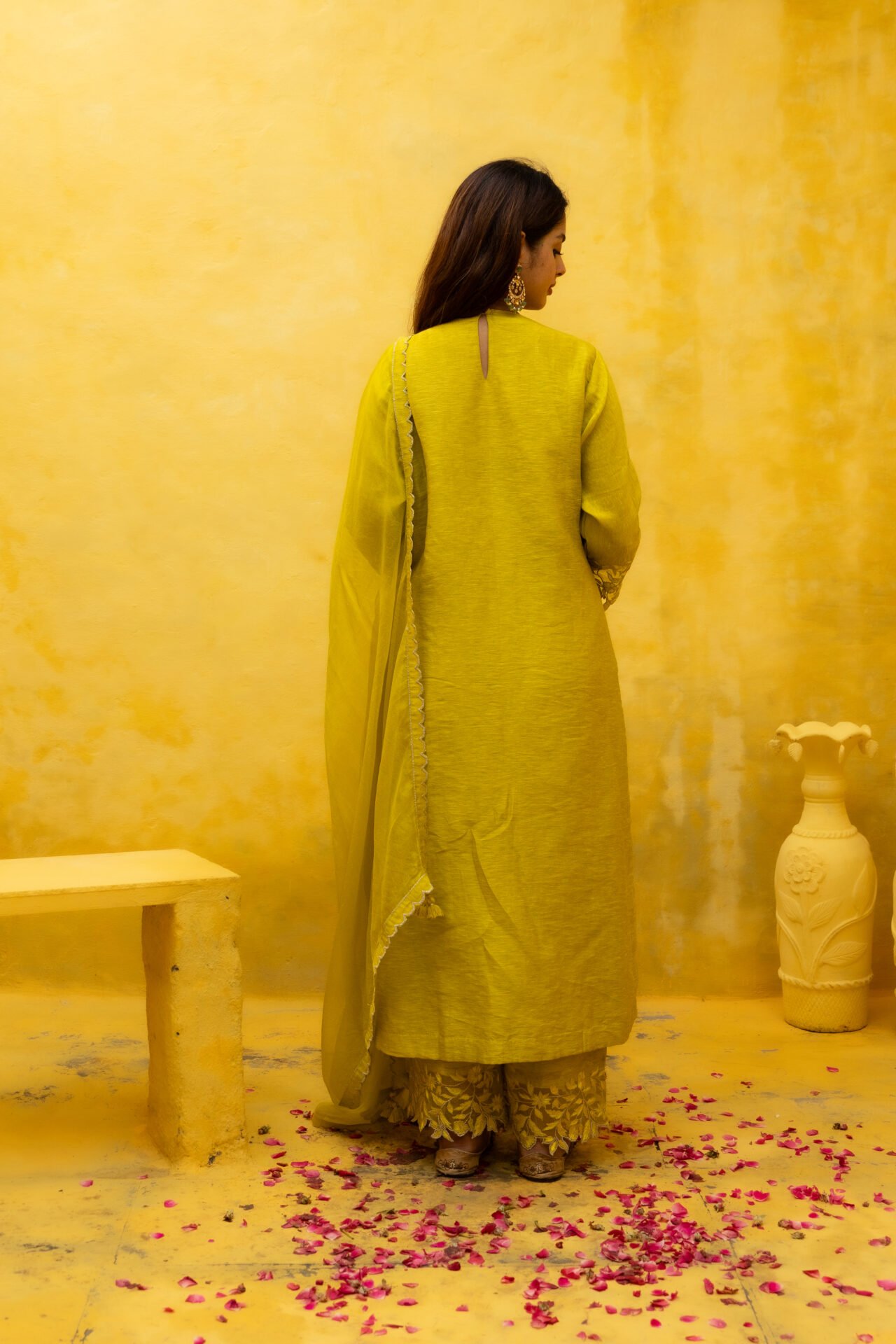 Crafted in fine jute linen, this ensemble in a refreshing lime hue offers a perfect blend of elegance and comfort. The kurta features intricate ek taar tonal Resham and zari embroidery, adding a delicate yet striking detail. The sleeves and pants are adorned with matching cutwork borders, crafted on pure silk organza, bringing a touch of refinement to the look. The kurta’s straight-cut pattern flatters all body types, offering both style and ease. The dupatta, made of pure silk organza, is finished with a jute linen cutwork border and hand-made tassels on the edging, adding a graceful, hand-crafted finish to this sophisticated set. kurta Finished with façade edges and hand-done turpai, this set reflects timeless elegance and craftsmanship
