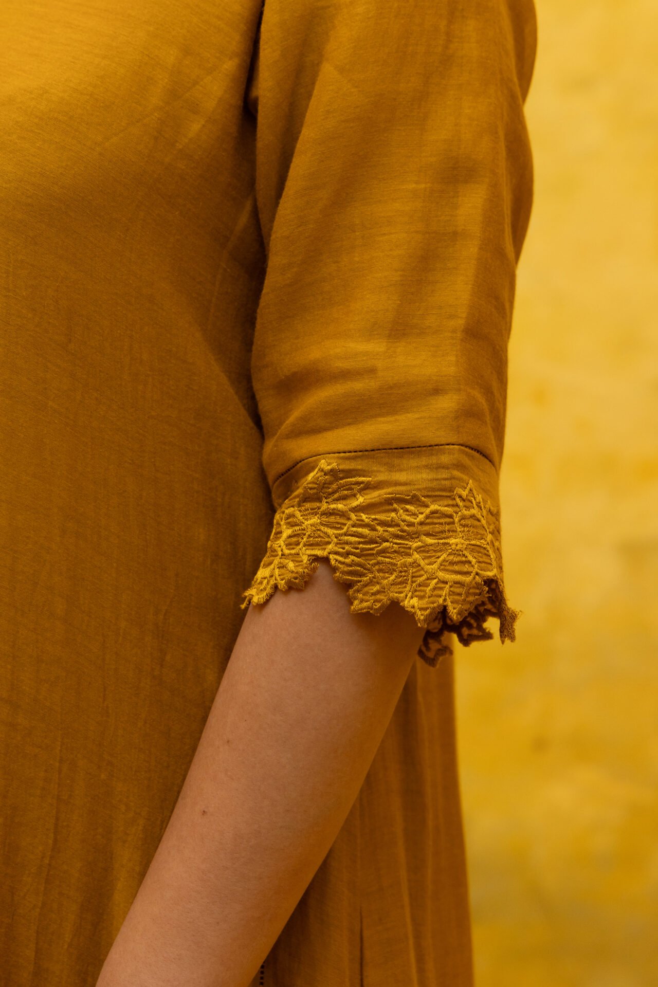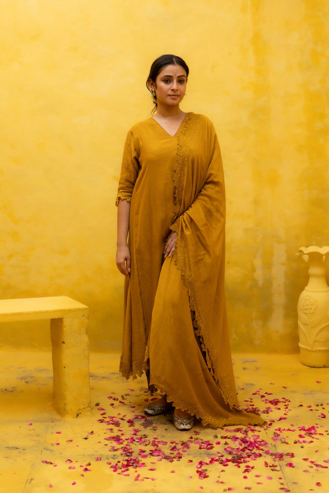 This elegant A-line kurta, crafted in pure Malai Chanderi and deep mud mustard hue, features delicate bead work neckline and cutwork-embroidered sleeves that exude a sophisticated charm. The kurta is adorned with zali and delicate thread-embroidered cutwork border on the daman adding texture and depth to the design.Paired with matching cutwork-embroidered pants, this ensemble creates a graceful and contemporary look. The A-line silhouette offers a flattering fit, making it a perfect choice for those seeking a blend of modern style and classic elegance. The dupatta completes the look with an intricate cutwork border, adding a touch of refinement to this beautifully detailed set.
